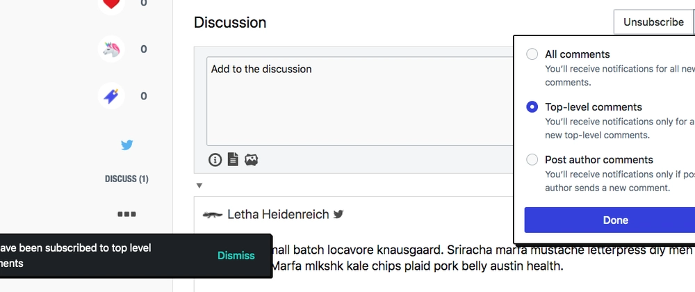 You could already subscribe to a post’s comments on DEV, but the problem was many community members were not aware that you could. We had this feature pretty well hidden. From a post page, you had to click on the three dots to see a post’s comment subscription options.