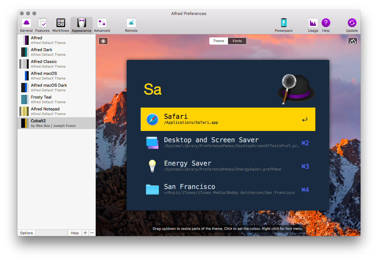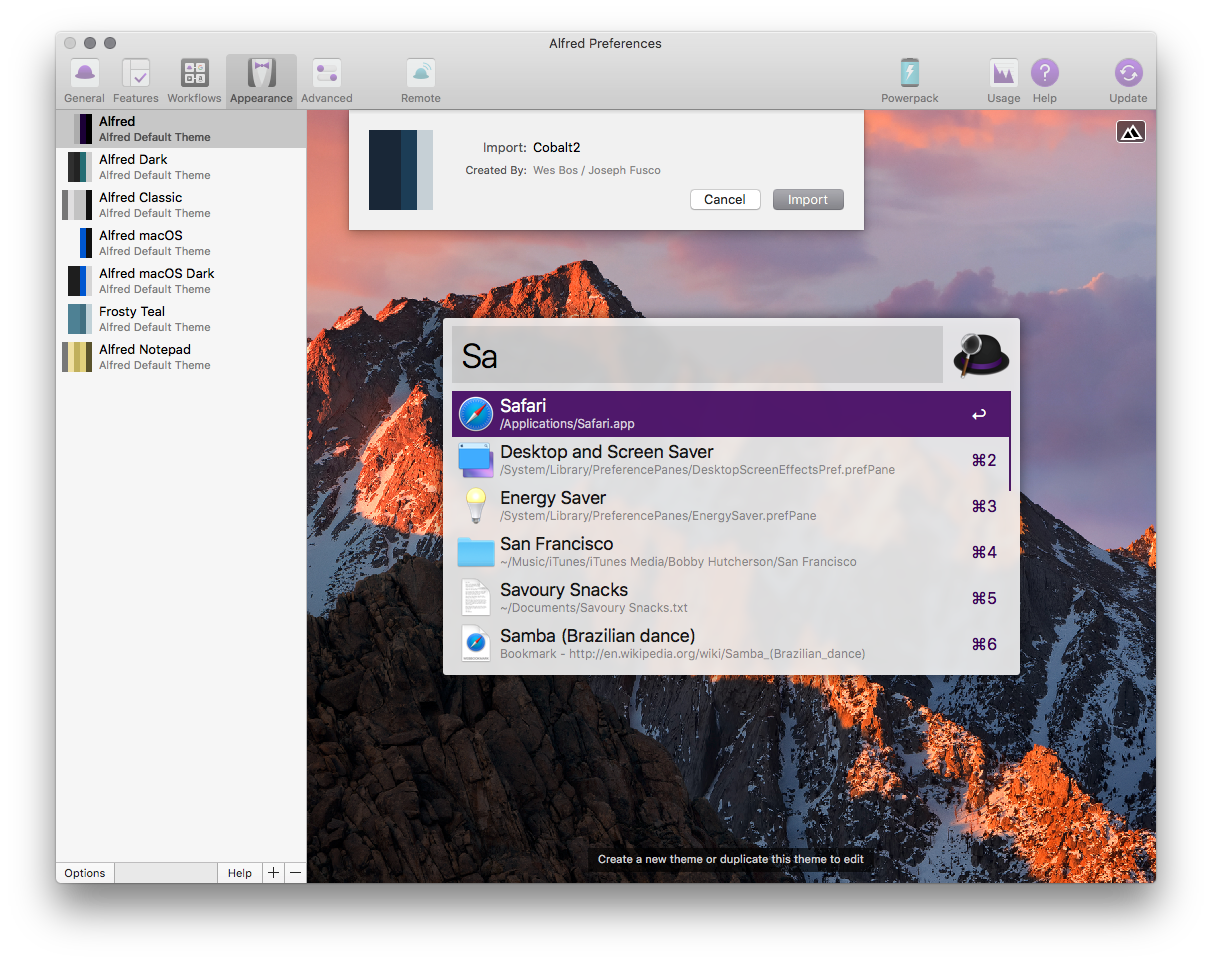 Along with workflows, you can also install themes. I like Wes Bos’ Cobalt 2 theme for other things and I guess since Wes is a huge fan of Alfred, he decided to make the theme for Alfred as well. Download the raw Cobalt 2 theme file from the github.com/wesbos/Cobalt2-Alfred-Theme repository. Once downloaded, open the file and it will ask you if you want to import the theme into Alfred.